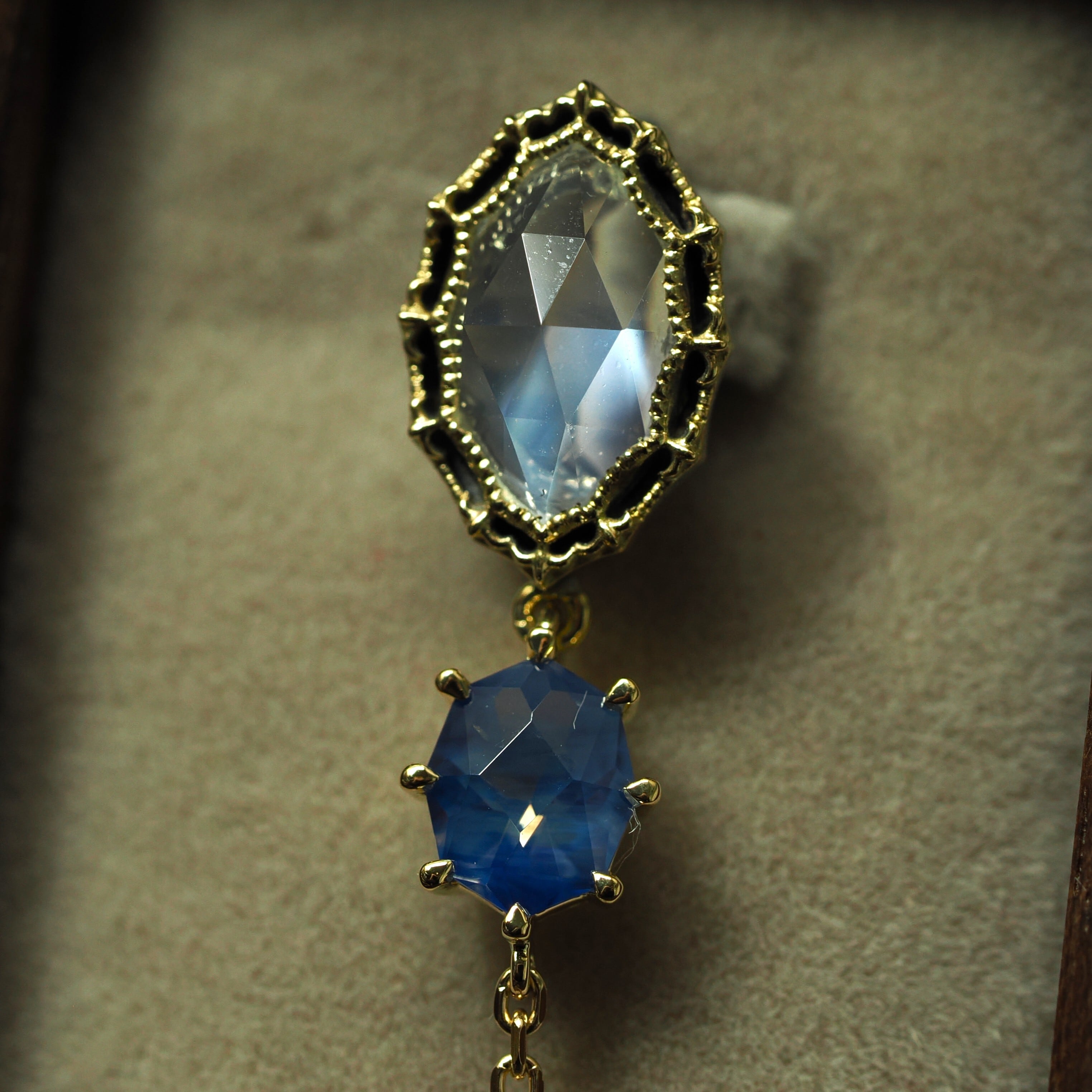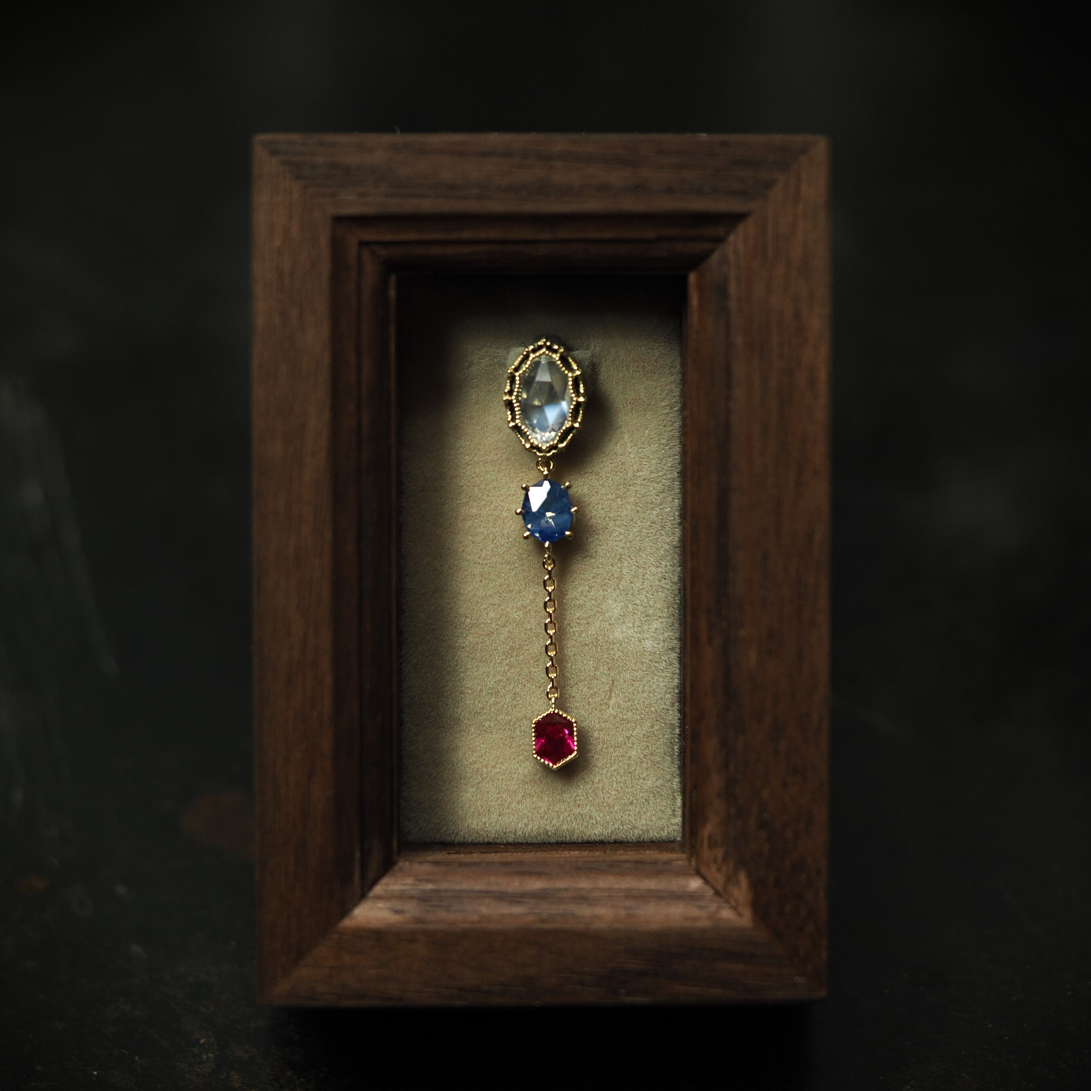 ムーンストーンさんの枠には、極小唐草をK18YGで制作し、黒くしたシルバーの土台に配置しております。サファイアさんの枠は全面磨き込んだK18YG。これまた極小のしずく型爪になります。ルビーさんのミルも極小です。