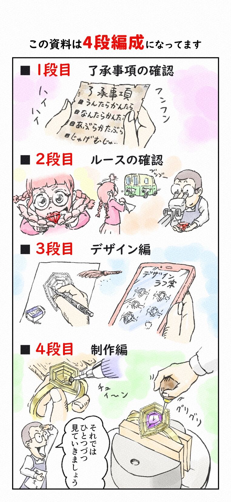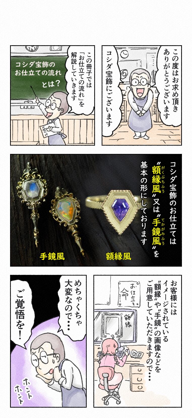マンガ仕立てで、コシダ宝飾独自の流れを解説しております。